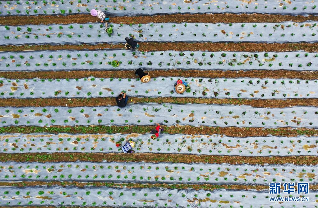 5月13日,村民在玉屏侗族自治縣田坪鎮(zhèn)慶寨村辣椒種植基地勞作(無人機(jī)照片)。