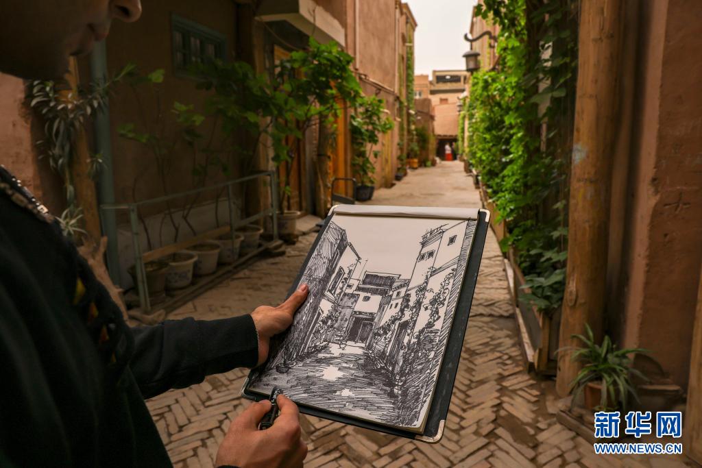 麥麥提吐爾遜江·麥麥提依明在新疆喀什古城景區(qū)的小巷內(nèi)進(jìn)行速寫創(chuàng)作(5月6日攝)。新華社記者 胡虎虎 攝
