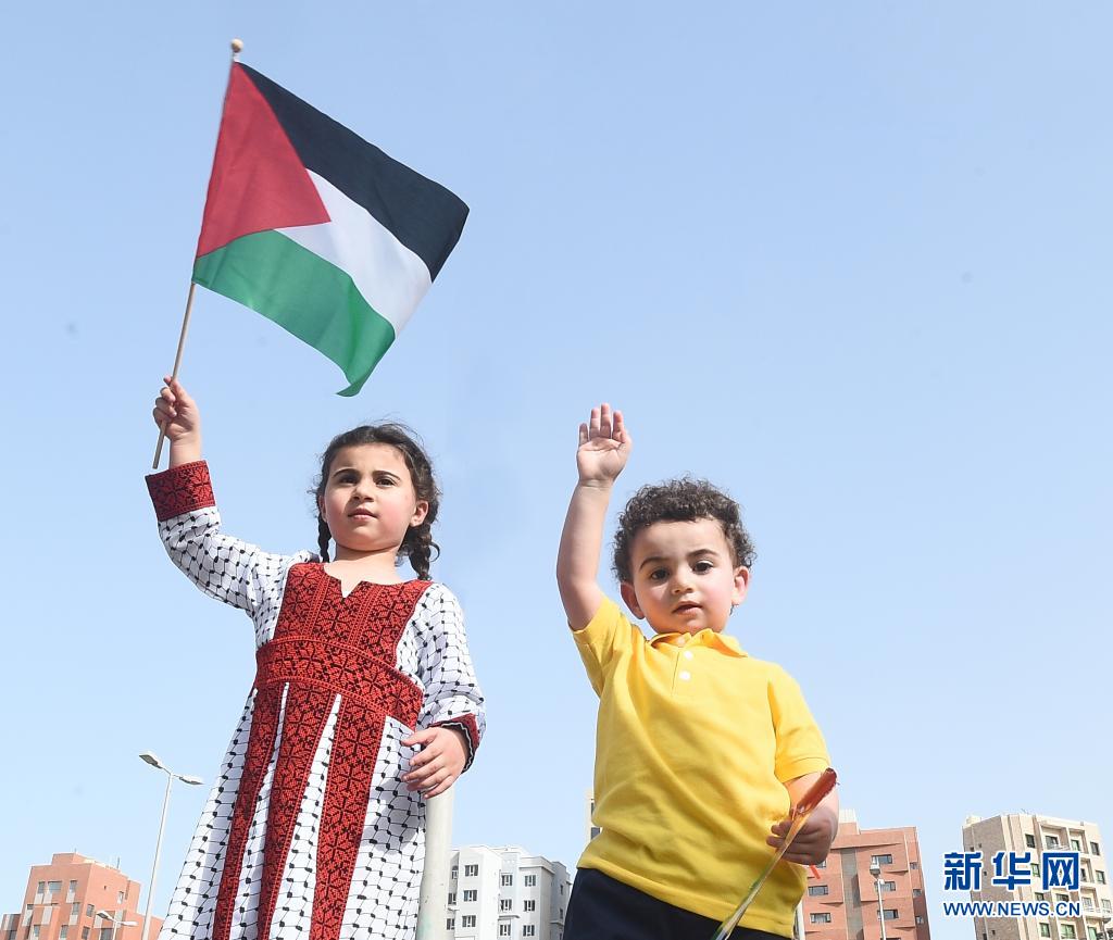 5月15日,兒童在科威特哈瓦利省參加抗議示威活動(dòng),聲援巴勒斯坦民眾。