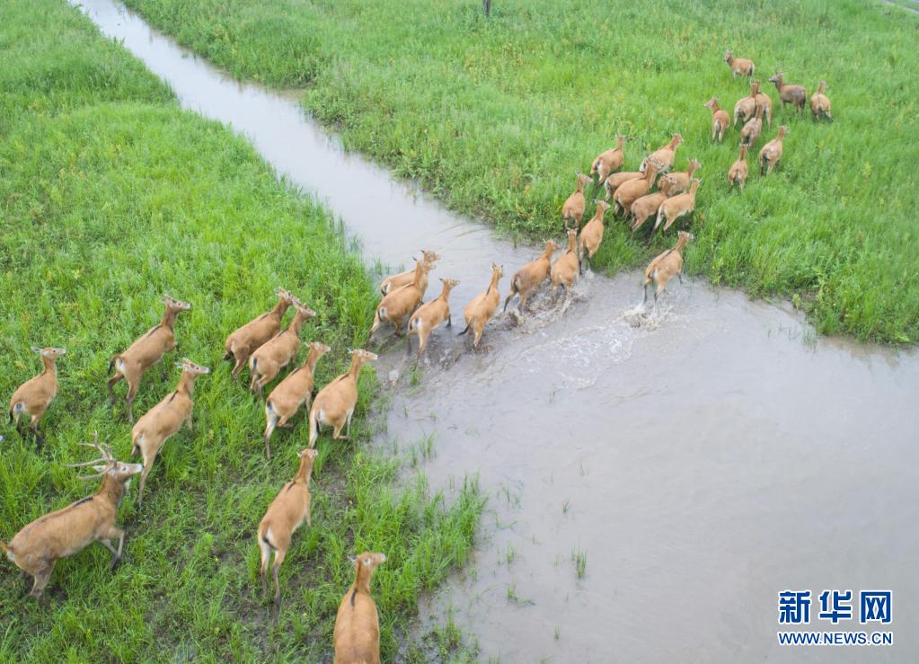 5月17日,一群麋鹿在石首麋鹿國家級自然保護(hù)區(qū)內(nèi)活動(無人機照片)。新華社記者 肖藝九 攝