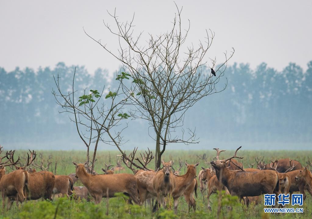 5月17日,一群麋鹿在石首麋鹿國家級自然保護(hù)區(qū)內(nèi)活動。新華社記者 肖藝九 攝
