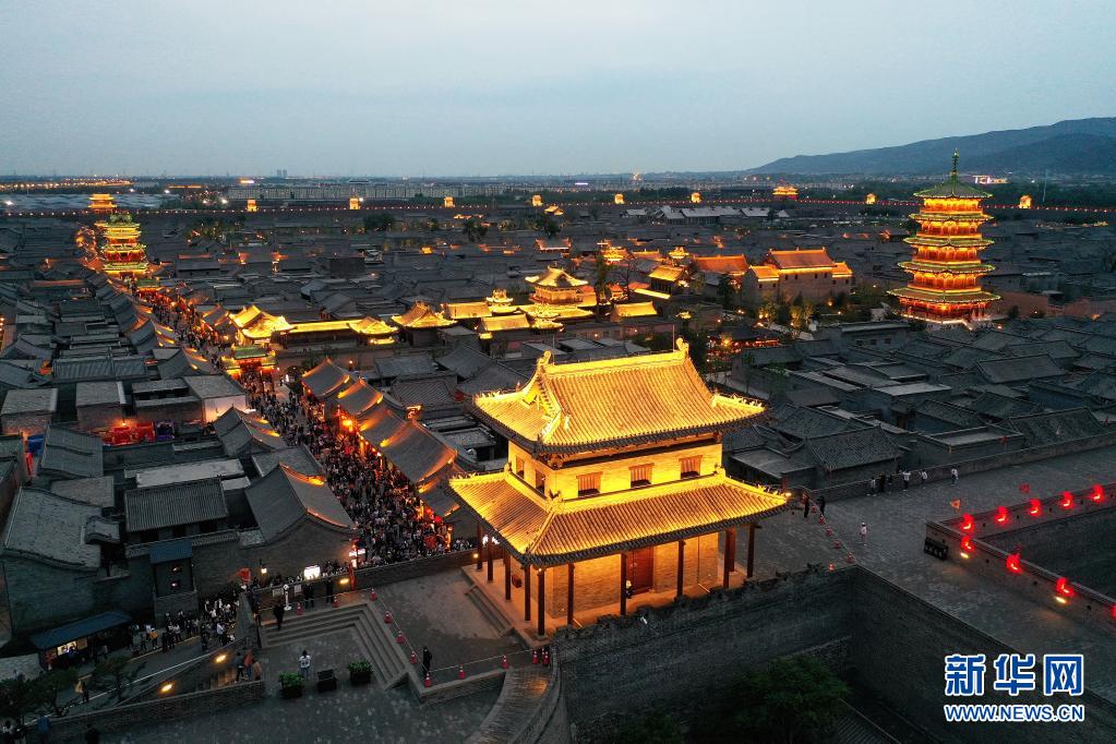 夜幕降臨,位于山西省太原市晉源區(qū)的太原古縣城流光溢彩,游人如織。太原古縣城始建于明代,占地面積約0.8平方公里,因其造型像一只飛鳥(niǎo),也被譽(yù)為“鳳凰城”。歷經(jīng)8年修繕后,太原古縣城于2021年5月重新對(duì)外開(kāi)放。