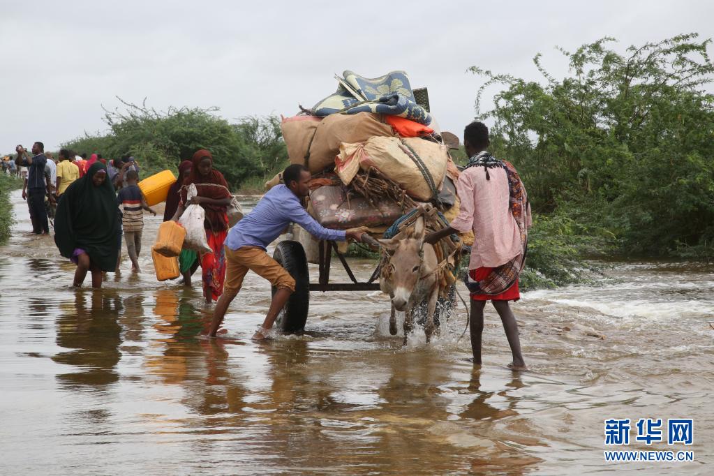強降雨導(dǎo)致索馬里多地洪水泛濫。新華社發(fā)(哈桑·巴希攝)