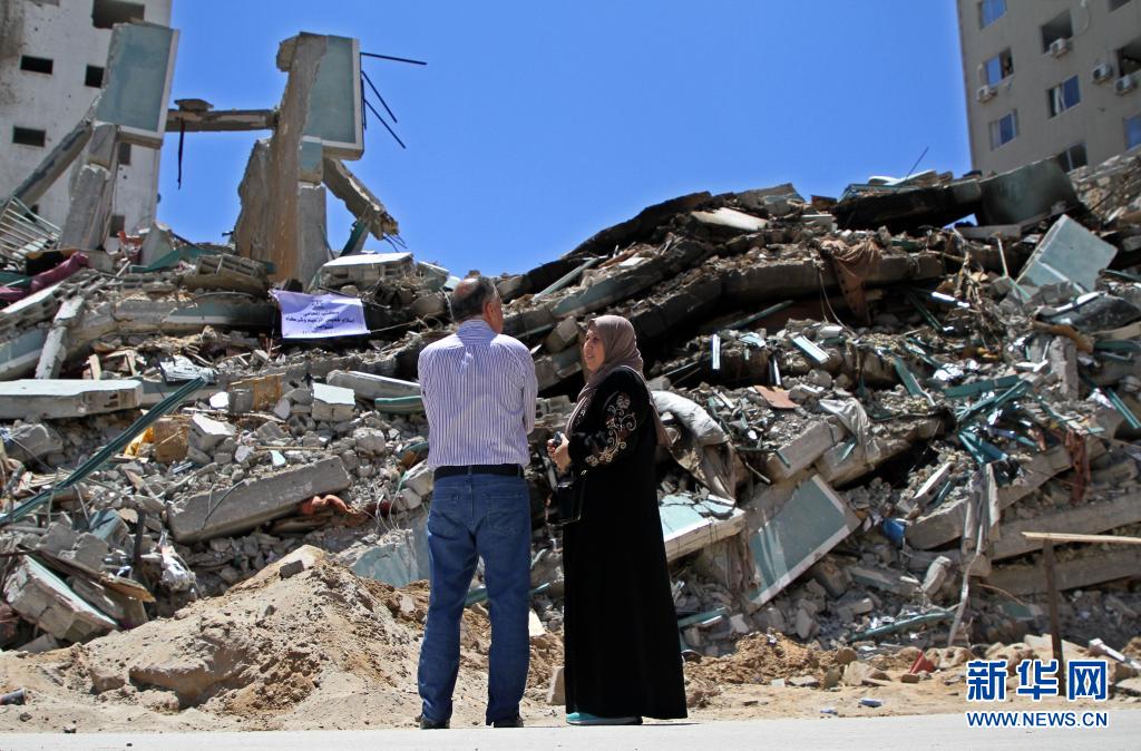 5月23日,巴勒斯坦人在加沙城望著遭以軍空襲損毀的賈拉塔。5月10日以來,以色列與加沙地帶武裝組織之間爆發(fā)嚴重沖突。20日晚,哈馬斯與以色列方面各自宣布,雙方已達成停火協(xié)議,?;饛?1日凌晨開始。新華社發(fā)(里澤克·阿卜杜勒·賈瓦德攝)