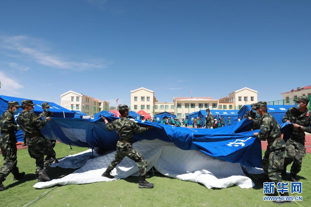 5月24日,武警青??傟?duì)果洛支隊(duì)機(jī)動大隊(duì)官兵為花石峽鎮(zhèn)藏文中心寄宿制小學(xué)搭建帳篷教室。新華社記者 劉芳 攝