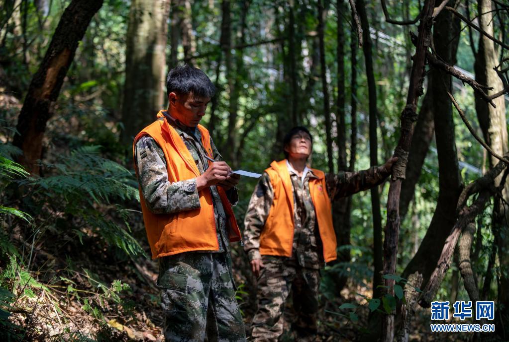 護(hù)林員楊有山(左)在林間記錄天行長(zhǎng)臂猿家庭的活動(dòng)情況(3月15日攝)。