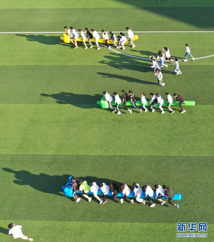 5月25日,湖南省永州市道縣第一中學的高三學生在做“同舟共濟”游戲(無人機照片)。
