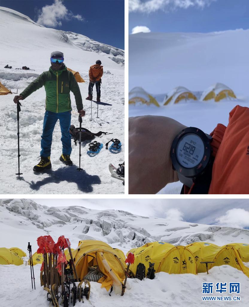 拼版照片:上左為別克米爾扎·圖爾達力在提供慕士塔格峰登山協(xié)作服務時,由C1營地前往C2營地途中(2019年7月24日攝),上右為別克米爾扎到達慕士塔格峰海拔6200多米的地點(2019年攝);下圖為別克米爾扎拍攝的C1營地(2019年6月22日攝)。新華社發(fā)