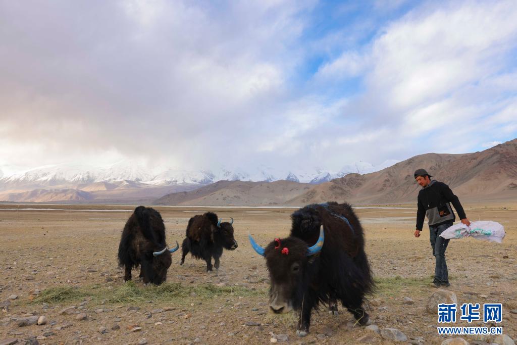 在蘇巴什村旁的牧場上,別克米爾扎·圖爾達(dá)力給剛找回來的三頭牦牛喂飼草料(5月14日攝)。新華社記者 胡虎虎 攝