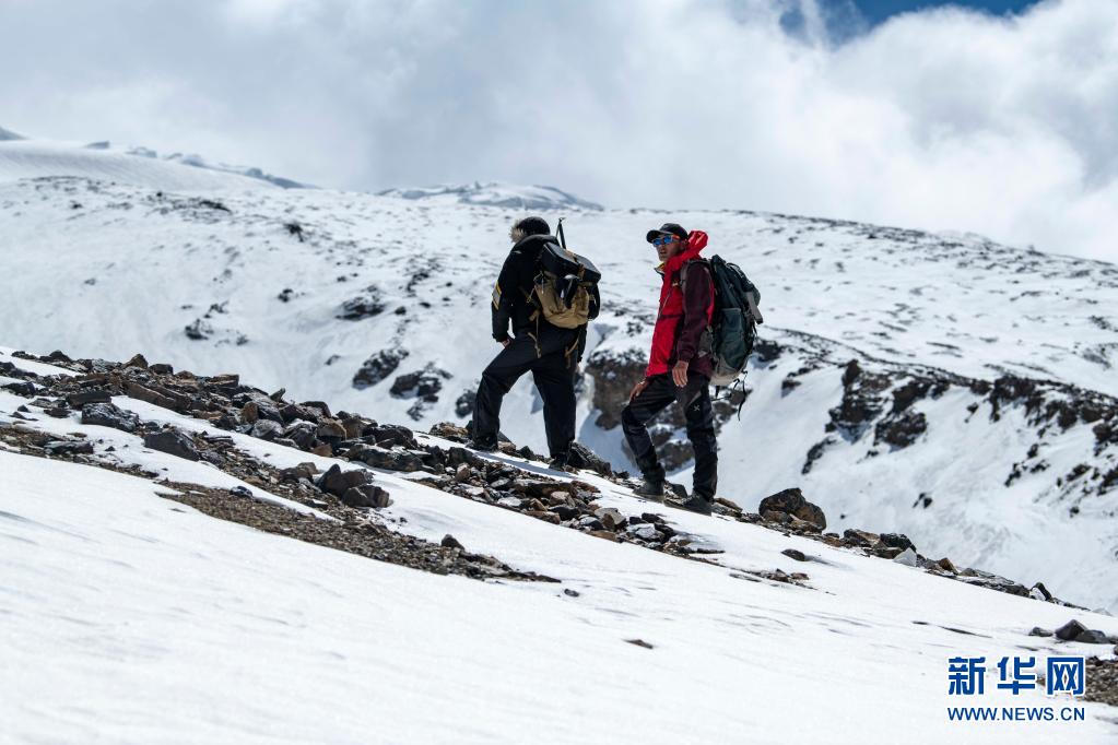 在當(dāng)天的適應(yīng)性訓(xùn)練中,別克米爾扎·圖爾達(dá)力(左)和同伴庫(kù)爾班巴依·努爾麥麥提行進(jìn)在慕士塔格峰海拔約5000米的山路上(5月15日攝)。新華社記者 胡虎虎 攝