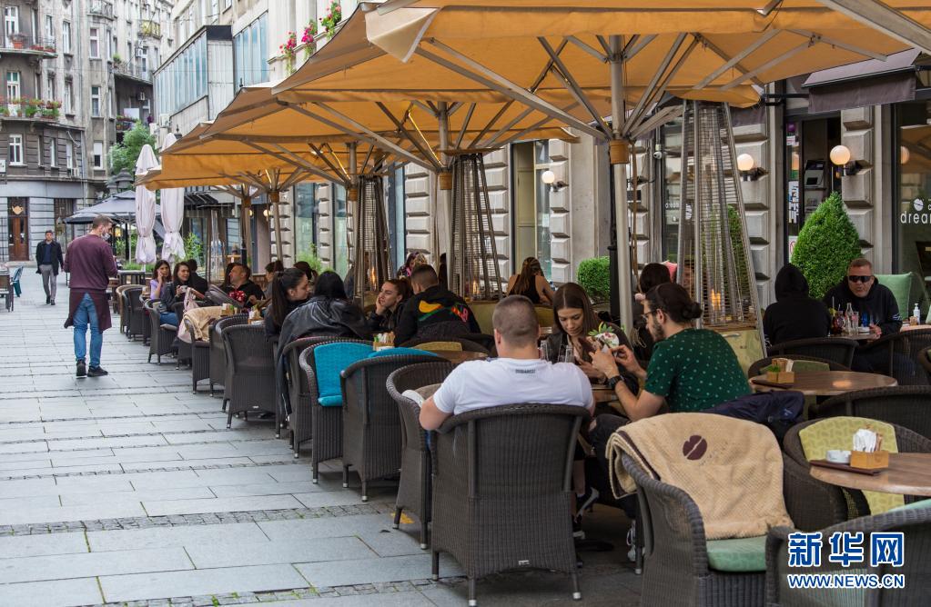 5月31日,在塞爾維亞貝爾格萊德,人們在一家餐廳的室外餐區(qū)用餐。