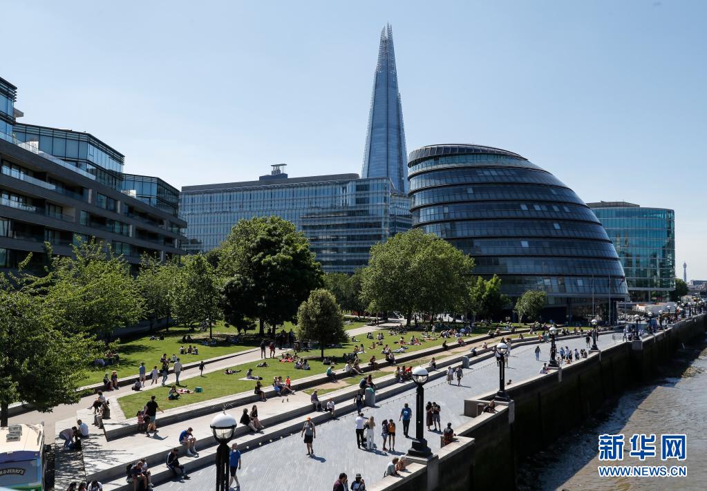6月1日,人們在英國倫敦市政廳前的綠地上休閑。