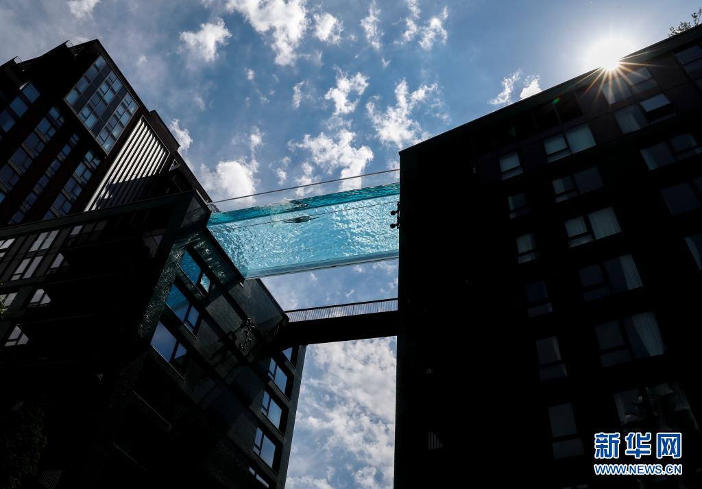 6月2日,一名男子在英國倫敦南部一個建造于兩棟公寓樓之間的“空中泳池”游泳。