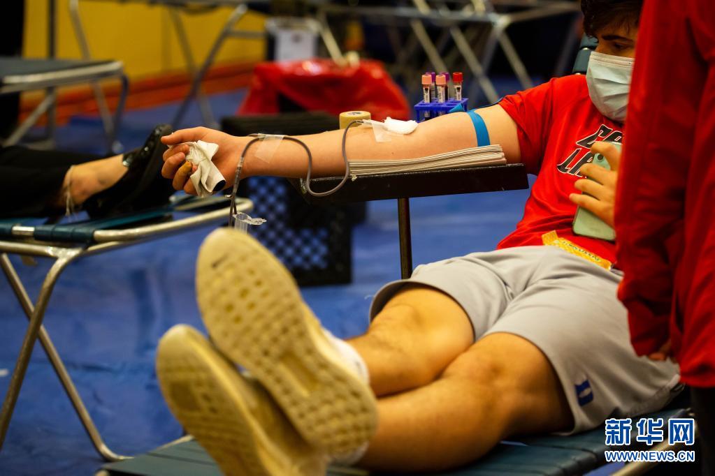 6月14日,在美國紐約州長島地區(qū)的尤寧代爾,獻(xiàn)血志愿者在美國紐約血液中心舉行的獻(xiàn)血活動上獻(xiàn)血。
