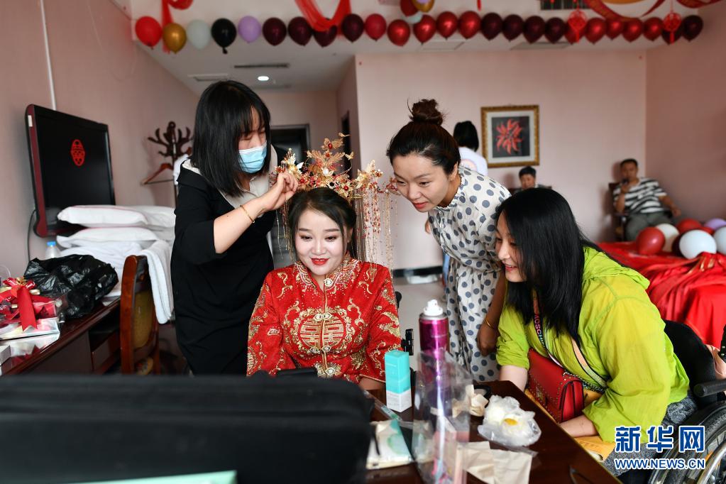 在山西省呂梁市石樓縣,化妝師(左一)和親友在給關(guān)美整理頭飾(6月15日攝)。新華社記者 詹彥 攝