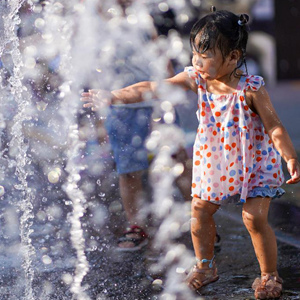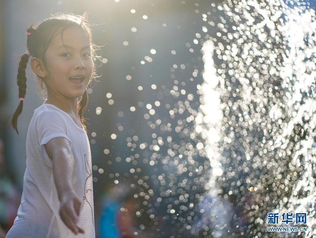 6月20日,小女孩在北京華熙LIVE·五棵松商業(yè)街區(qū)一處噴泉戲水。