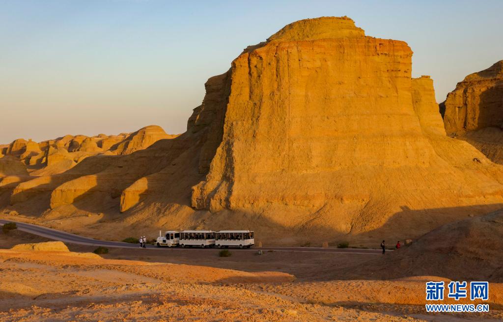 游客乘坐觀光車在新疆克拉瑪依烏爾禾世界魔鬼城景區(qū)內(nèi)游玩(6月21日攝)。