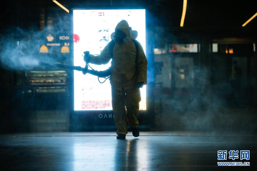 6月24日,工作人員身著防護(hù)服在俄羅斯莫斯科一個(gè)火車站進(jìn)行消毒作業(yè)。