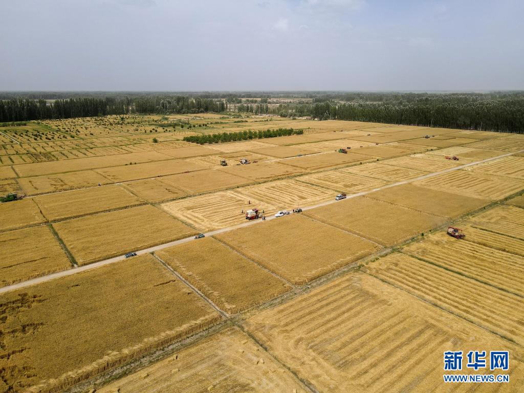 6月19日,空中俯瞰麥客阿地力·沙拉木工作的新疆庫(kù)車(chē)市齊滿(mǎn)鎮(zhèn)的麥?zhǔn)宅F(xiàn)場(chǎng)(無(wú)人機(jī)照片)。新華社記者 高晗 攝