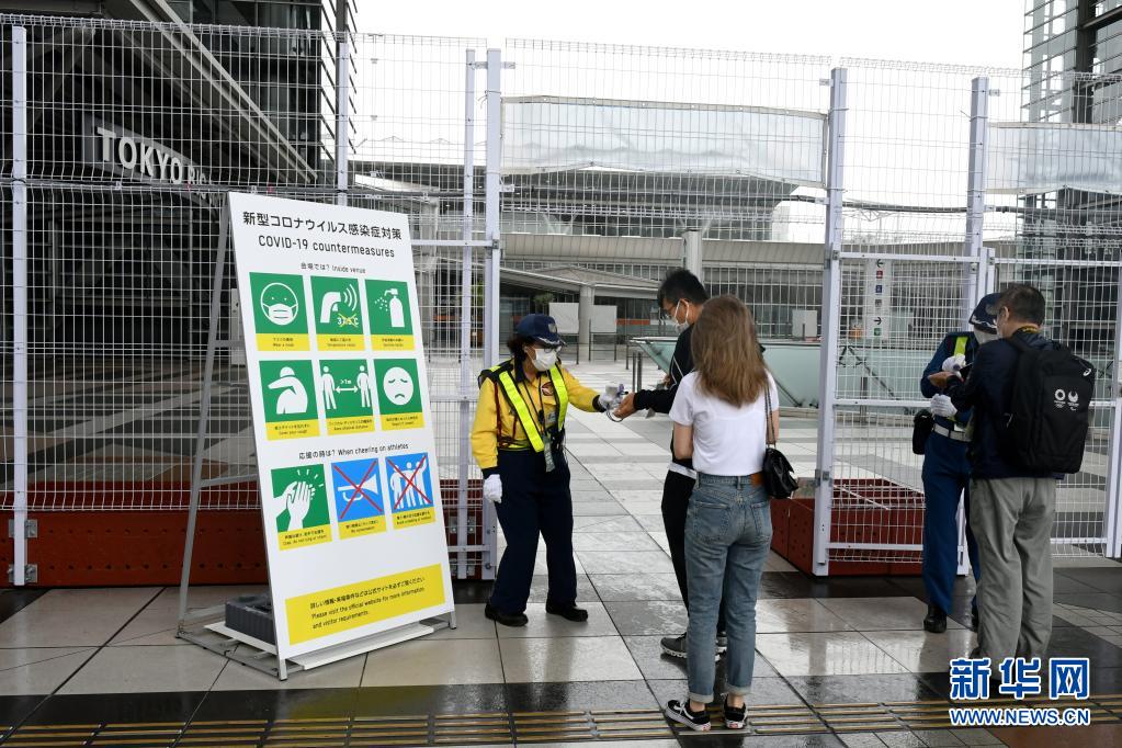 7月1日,工作人員在奧運會主新聞中心入口檢查證件和測量體溫。新華社記者 華義 攝