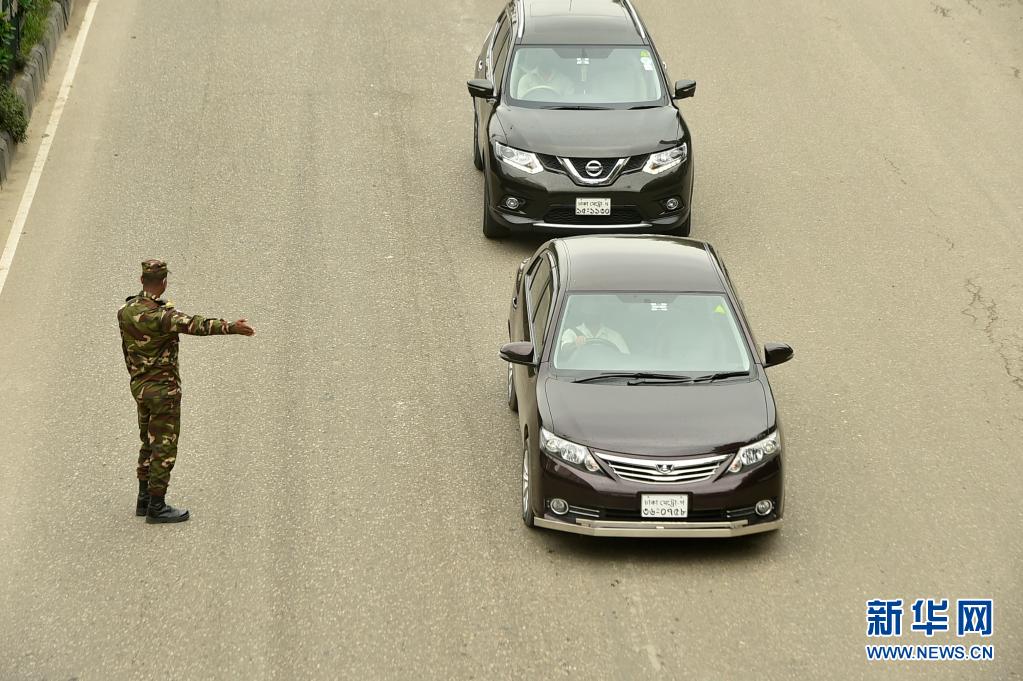 7月1日,軍人在孟加拉國達卡的街道上攔停過往車輛。