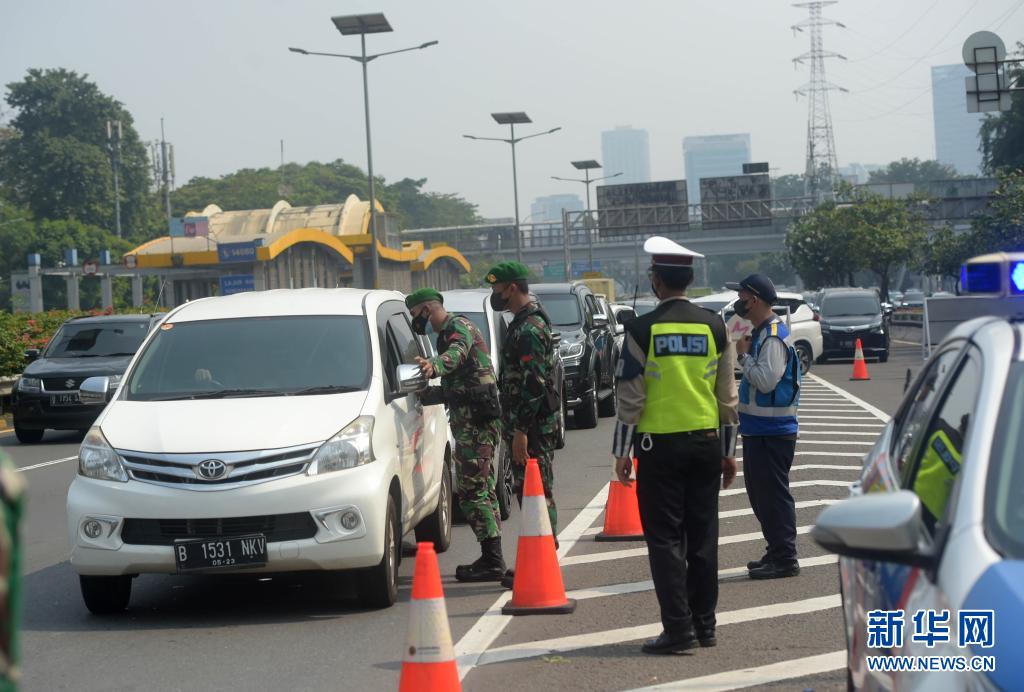7月5日,安全人員在印度尼西亞雅加達一處檢查站檢查過往車輛。