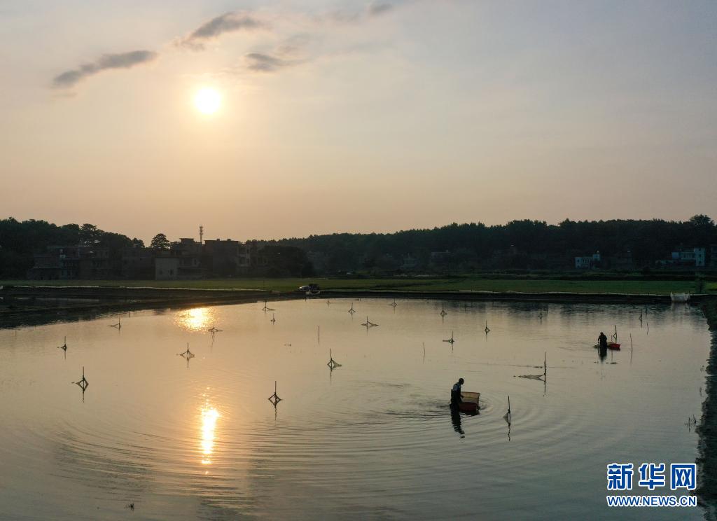 7月5日,在湖南省永州市道縣蚣壩鎮(zhèn)洲背村,村民在收獲小龍蝦(無人機(jī)照片)。