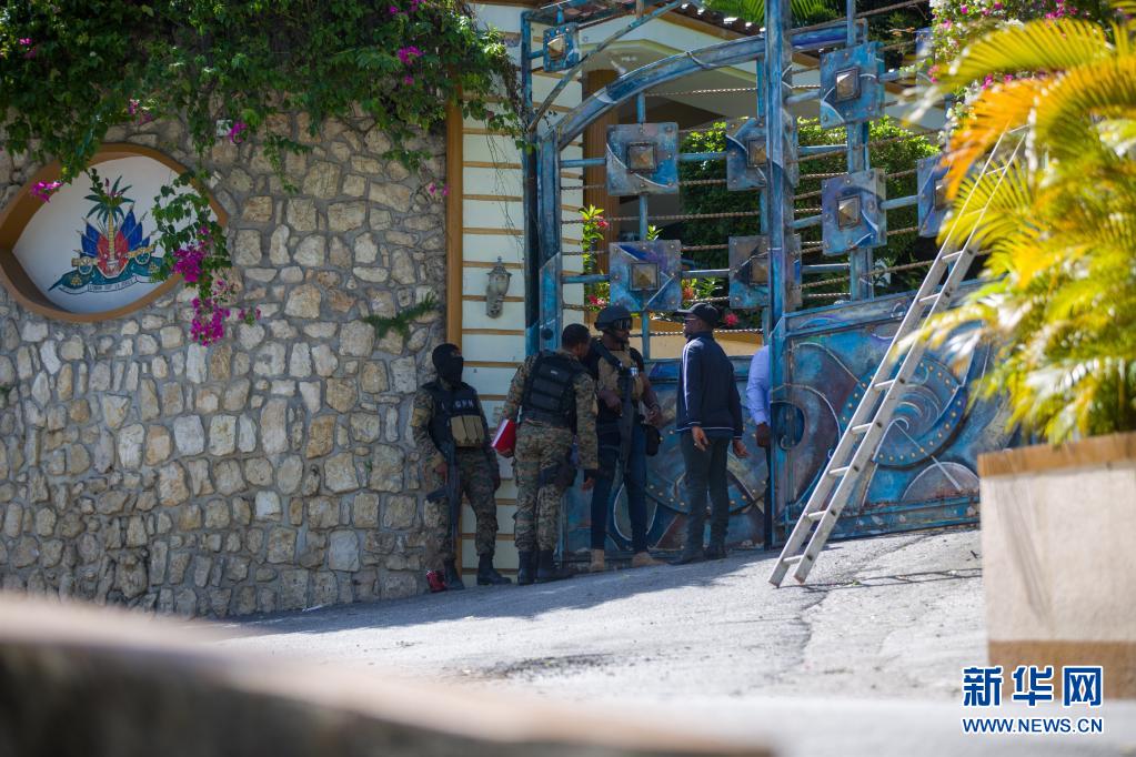 7月7日,在海地太子港,士兵在海地總統(tǒng)莫伊茲的住所入口處執(zhí)勤。