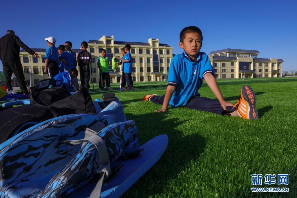 塔城市第二小學(xué)曲棍球隊(duì)的小隊(duì)員在訓(xùn)練賽前拉伸身體,準(zhǔn)備上場(chǎng)(6月13日攝)。