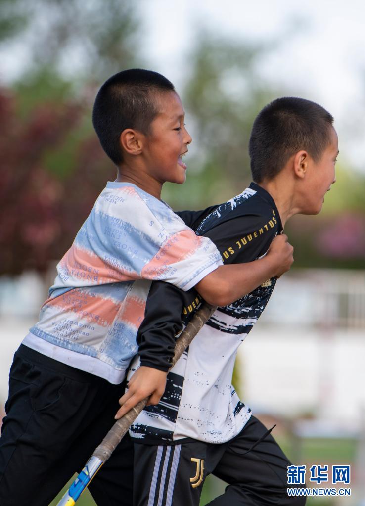 塔城市第二小學曲棍球隊的小隊員申世豪(左)和隊友哈爾肯·夏里甫歡呼慶祝訓練賽中的進球(6月11日攝)。
