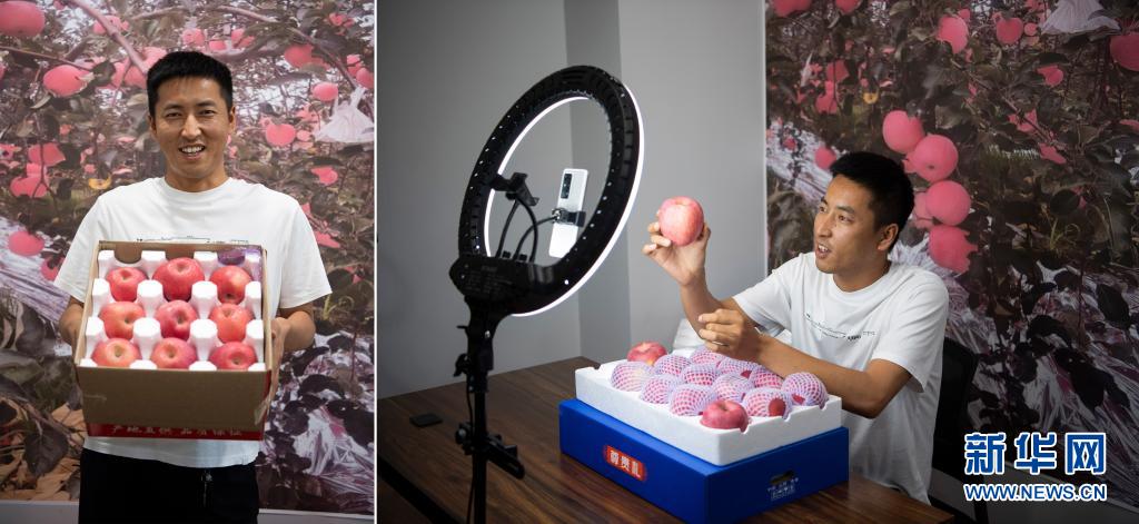 拼版照片:左圖為郭鋒杰展示山西省吉縣產的蘋果;右圖為郭鋒杰通過網(wǎng)絡直播銷售蘋果(7月9日攝)。今年32歲的郭鋒杰是吉縣古賢村人,常年在外從事建筑行業(yè)。吉縣有“蘋果之鄉(xiāng)”的美譽,看到吉縣蘋果在農村電商領域的發(fā)展?jié)摿?,郭鋒杰經過長期考察后,選擇返鄉(xiāng)創(chuàng)業(yè)。返鄉(xiāng)后,他忙著和果農洽談合作,聯(lián)系各大商超,自己也開起了網(wǎng)店,做起了“主播”。