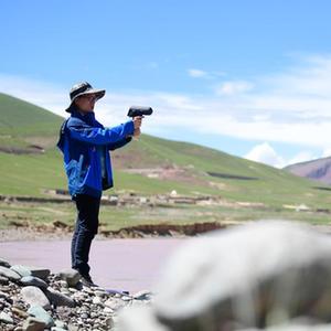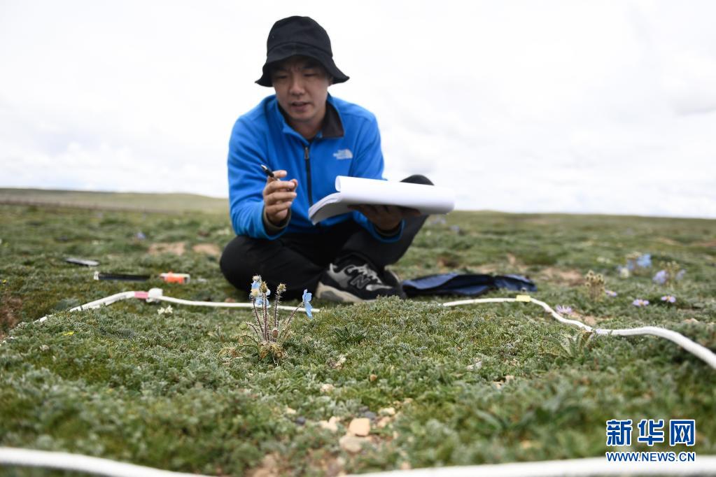 2021年長(zhǎng)江源綜合科考的科考隊(duì)員任斐鵬在長(zhǎng)江南源當(dāng)曲地區(qū)觀察高寒草甸(7月23日攝)。