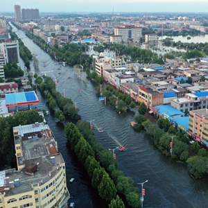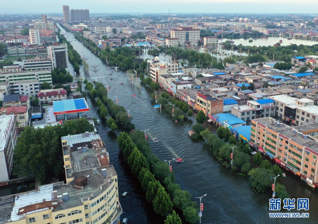 7月26日,在河南省衛(wèi)輝市,救援船只穿梭于城區(qū)內(nèi)(無人機(jī)照片)。