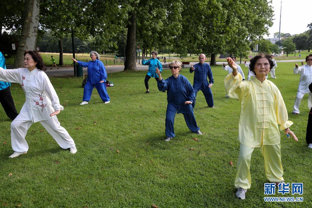 7月28日,人們在比利時布魯塞爾的拉肯公園練習(xí)太極。
