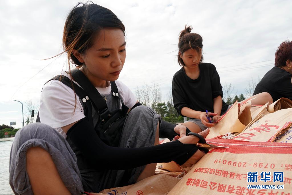 當日,在河南省鶴壁市??h傅莊堤上,不少群眾自發(fā)前來和救援人員一起裝沙袋、運沙袋,共筑堤壩。受持續(xù)強降雨影響,浚縣防汛形勢嚴峻,傅莊堤主要為??h縣城及26個村莊提供保護。新華社記者 李安 攝