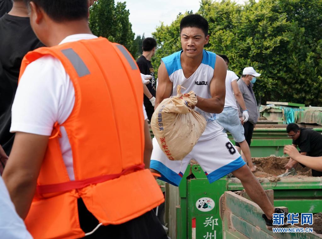 當日,在河南省鶴壁市浚縣傅莊堤上,不少群眾自發(fā)前來和救援人員一起裝沙袋、運沙袋,共筑堤壩。受持續(xù)強降雨影響,??h防汛形勢嚴峻,傅莊堤主要為??h縣城及26個村莊提供保護。新華社記者 李安 攝