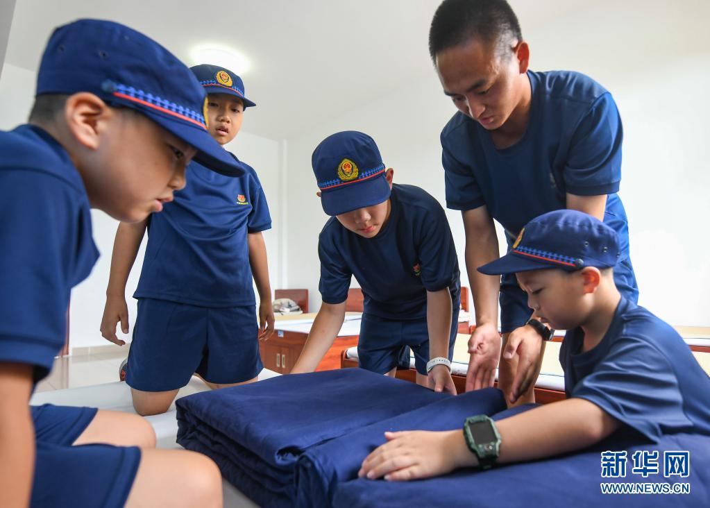 在四川省森林消防總隊特勤大隊,消防員畢成武(右二)教孩子們整理內(nèi)務(wù)(7月27日攝)。
