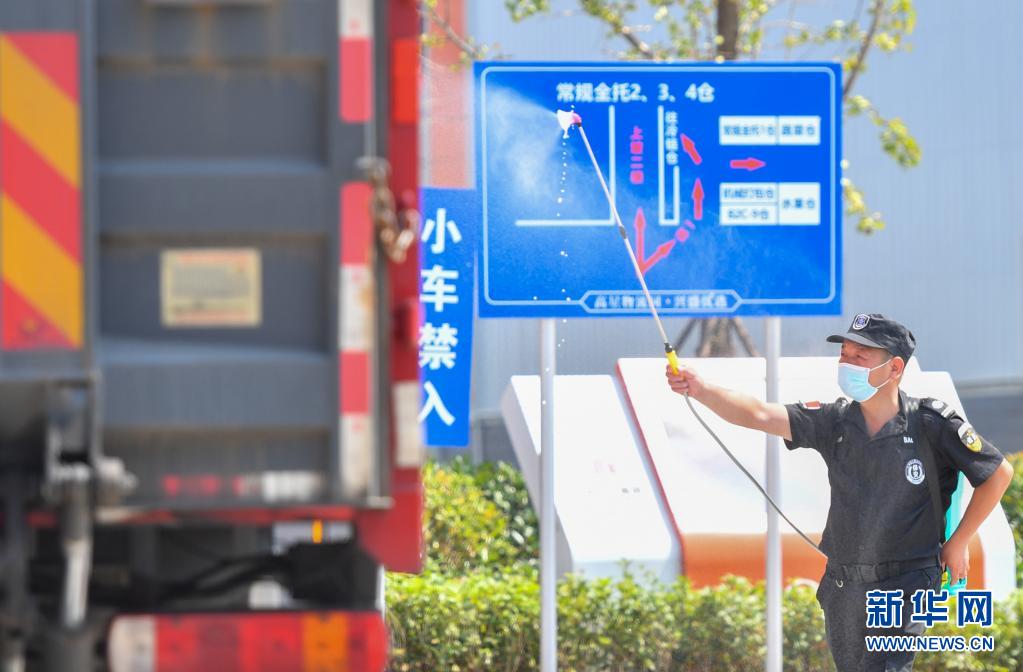 8月1日,在位于長(zhǎng)沙市望城區(qū)的湖南高星物流園門(mén)口,工作人員對(duì)進(jìn)入園區(qū)的貨車(chē)消毒。