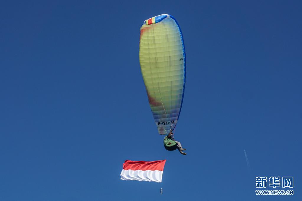 8月17日,懸掛印度尼西亞國旗的滑翔傘飛過巴厘島上空。8月17日是印度尼西亞獨(dú)立日。新華社發(fā)(比辛拉西攝)