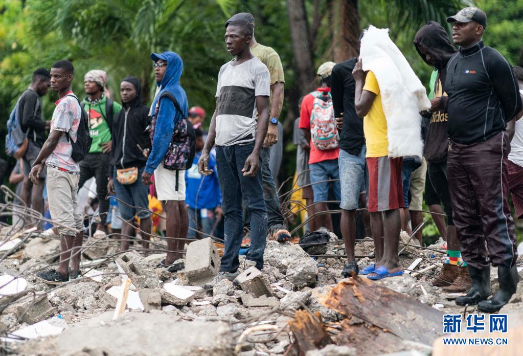 8月17日,人們站在海地萊凱的一處廢墟上。