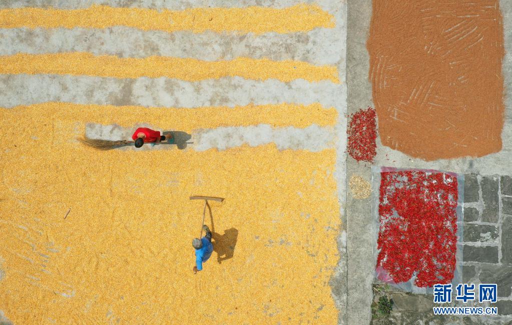 8月17日,赤水市華陽村的村民在晾曬玉米(無人機(jī)照片)。