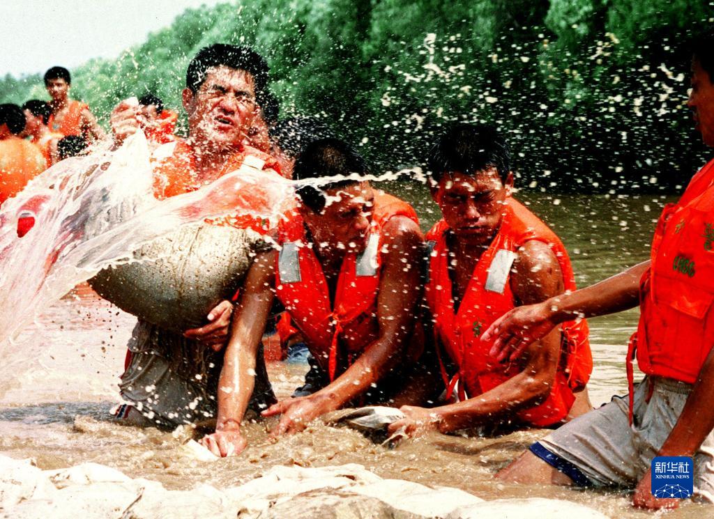 這是河北武警戰(zhàn)士在長江大堤上搶險(1998年8月16日攝)。