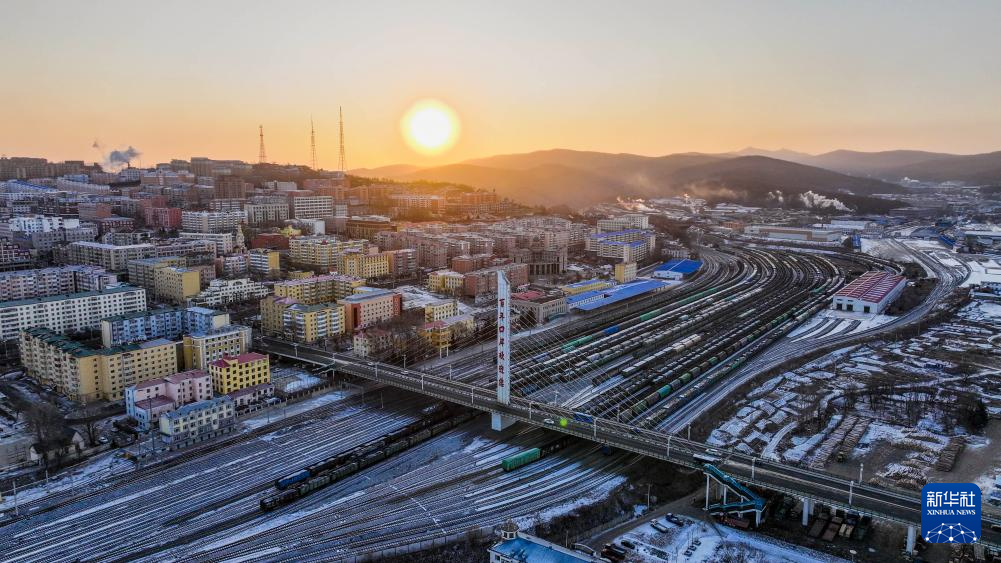 回程中欧班列停靠在绥芬河站南场(12月26日摄,无人机照片)。