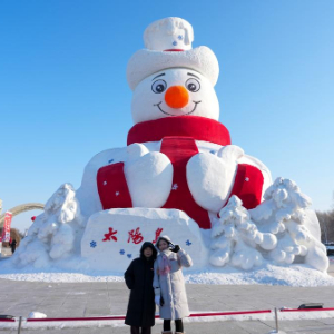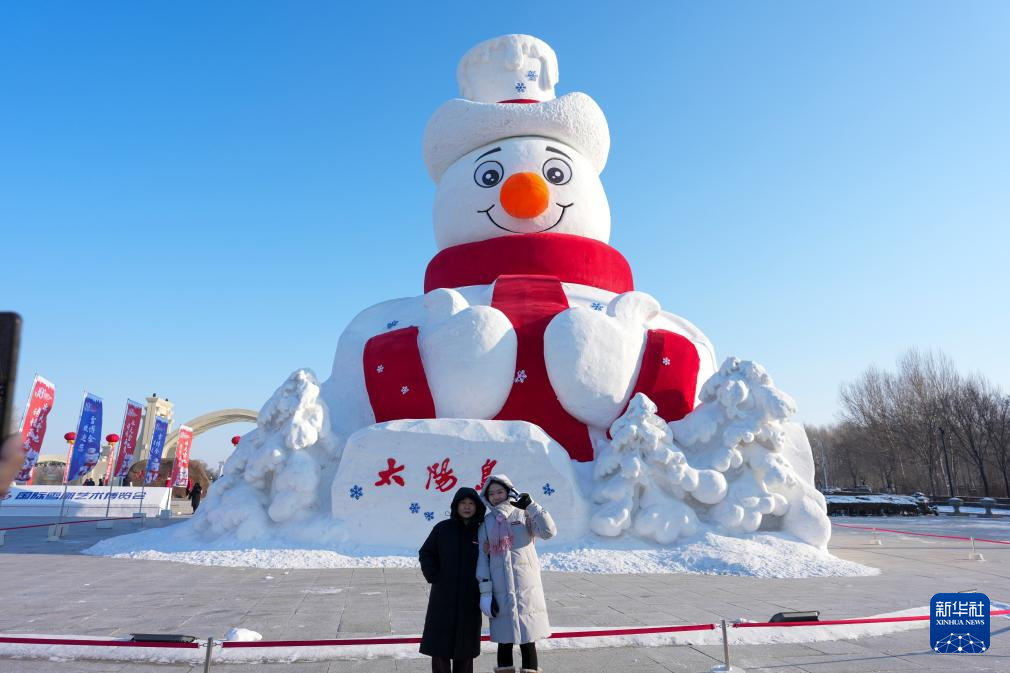 游客在第38届太阳岛国际雪雕艺术博览会园区大门前与大雪人景观合影(12月26日摄)。
