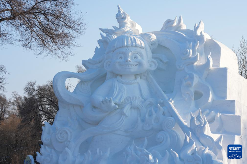 在第38届太阳岛国际雪雕艺术博览会园区,雪雕师对大型雪雕群景观进行创作收尾作业(12月26日摄)。