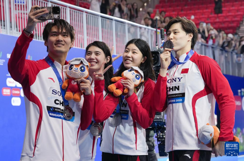 这是2025年7月30日,亚军中国队选手徐嘉余、张雨霏、吴卿风、覃海洋(从左至右)在2025年世界游泳锦标赛游泳男女4X100米混合泳接力颁奖仪式后自拍。