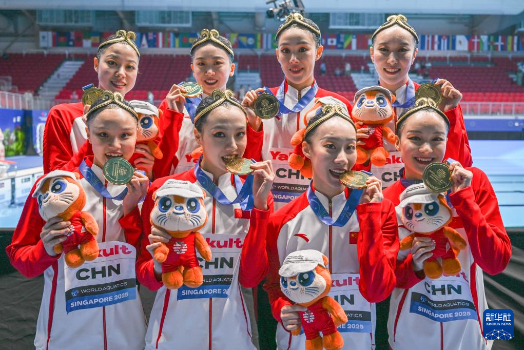 这是2025年7月22日,冠军中国队在2025年世界游泳锦标赛花样游泳集体技术自选颁奖仪式后合影。