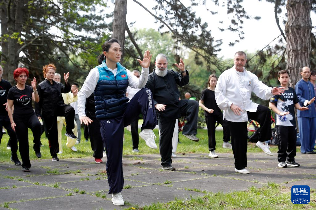 这是2025年4月26日,中国首都体育学院副教授李凤梅(左三)在罗马尼亚布加勒斯特与当地太极爱好者打太极拳。