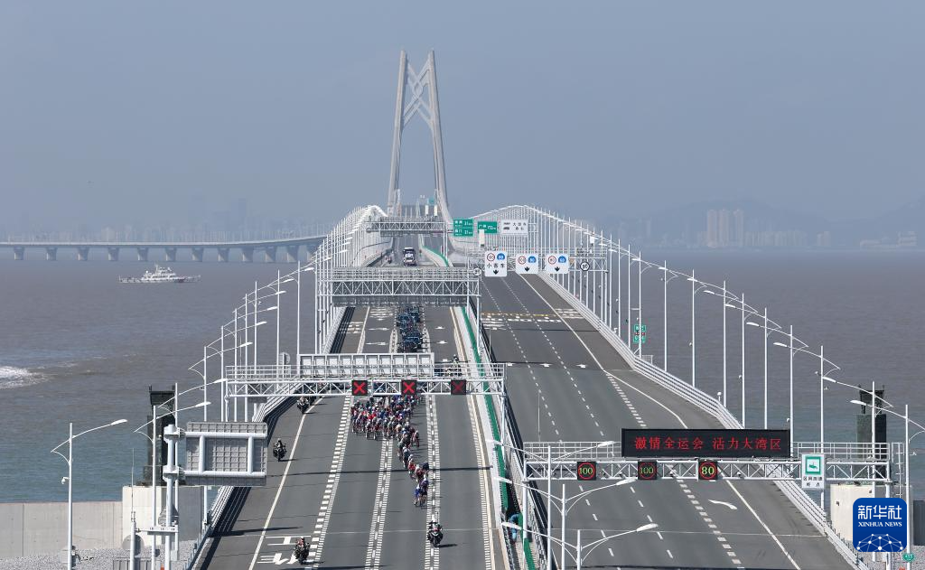 这是2025年11月8日,在第十五届全国运动会公路自行车男子个人赛决赛中,参赛选手在港珠澳大桥骑行。