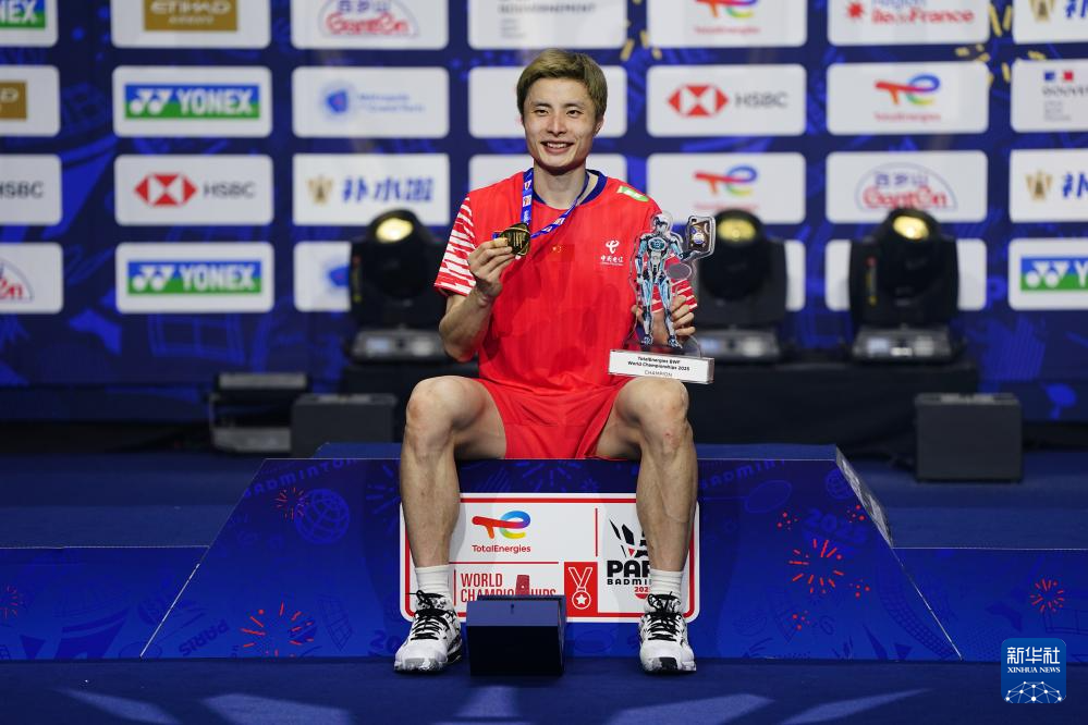 这是2025年8月31日,冠军石宇奇在2025年世界羽毛球锦标赛男子单打颁奖仪式上。